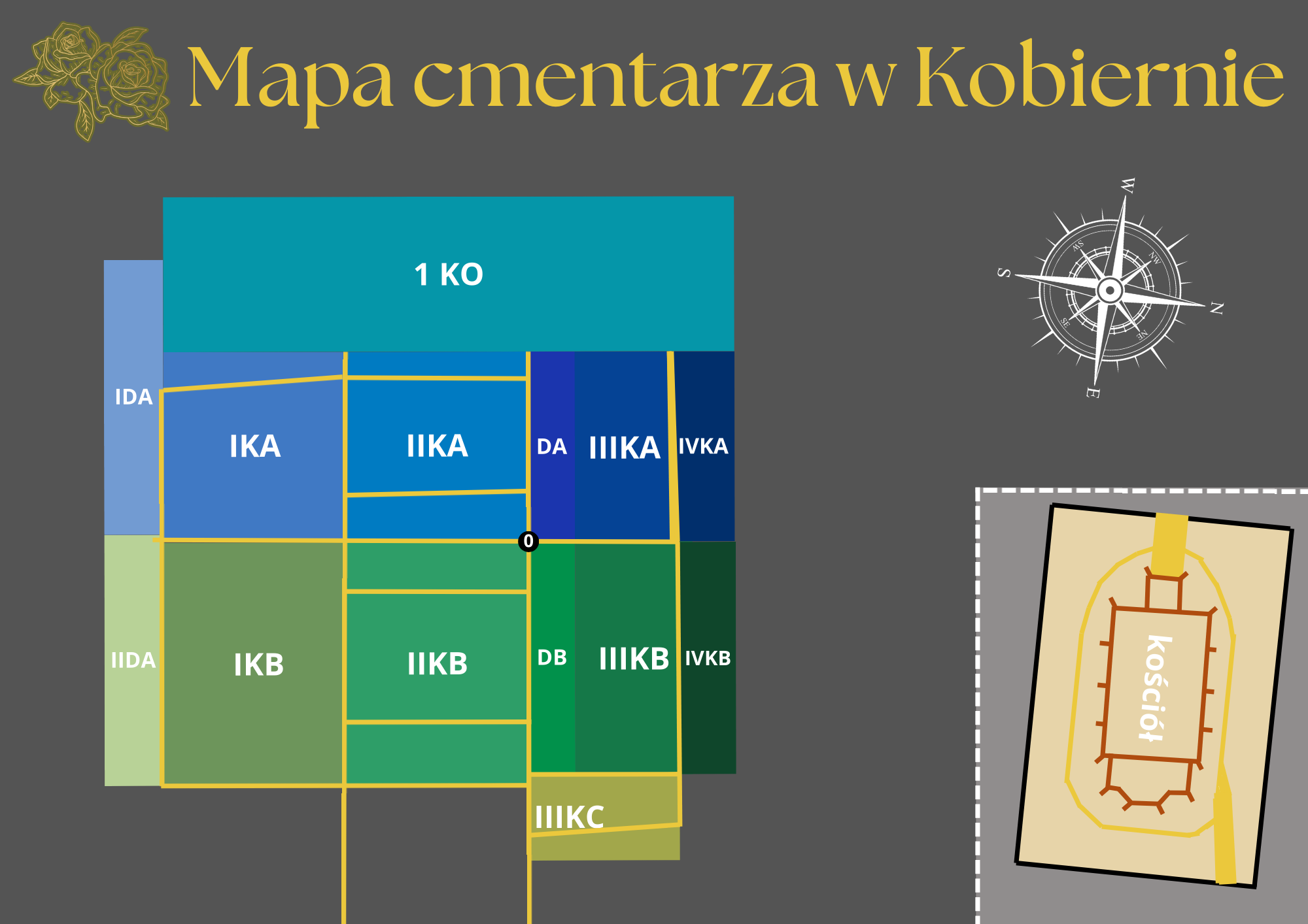 Baza zawiera osoby pochowane na cmentarzu przy ul. Cmentarnej w Kobiernie oraz przy kościele pw. św. Wojciecha przy ul. Kobierskiej w Kobiernie. Cmentarz został podzielony na sektory ok. 1996 r., jednak administratorzy bazy w porozumieniu z proboszczem dokonali modyfikacji. Groby liczone są od końca (patrząc od wejścia na cmentarz), od lewej strony do prawej. Idąc tym tropem wchodząc widzimy ostatnie rzędy danego sektora. Niezależnie od tego, czy groby są przodem, czy tyłem do bramy. Sektory IDA i IIDA, czyli boczne patrząc od bramy, liczone są od lewej strony. Patrząc zatem od bramy widzimy pierwsze groby. Sektory boczne prawe, czyli IVKA i IVKB, patrząc od bramy, liczone są również od lewej strony, dlatego patrząc od bramy widzimy groby ostatnie w rzędzie.